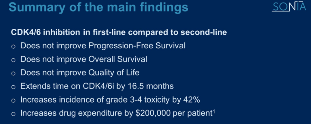 经过两组患者的比较,我们可以看到,一线患者治疗中选择CDK4/6抑制剂和二线治疗中选择CDK4/6抑制剂,总体的PFS和OS没有显著统计学差异。而当一线使用CDK4/6抑制剂时,患者≥3级不良事件增加42%。此外,每位患者的治疗费用也会增加将近20万美金。