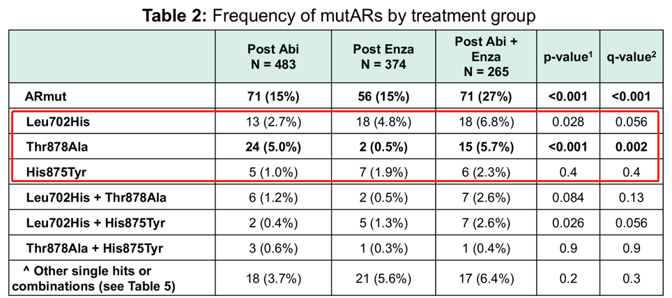 结果检测到了一些致病性/可能致病性AR突变,最常见的突变是Leu702His(abi组、enza组和abi+enza组:18%、32%和25%)、Thr878Ala(34%、3.6%和21%)、His875Tyr(7%、12%和8.5%)。这些突变对未来的临床决策和药物研发具有指示意义。