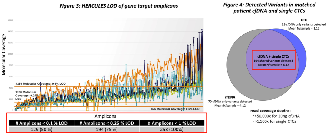 这项初步的验证研究显示,HERCULES检测体细胞变异显示了较高的敏感性。在等位基因频率为1%、0.25%和0.1%的DNA对照样品中,HERCULES检测的敏感性分别为100%、75%和50%。在来自8例患者的16个匹配cfDNA和单个CTC样本中,20ng cfDNA的读取覆盖深度>50000x,单个CTC的读取覆盖厚度>1500x,HERCULES检测到共享变异(每个样本的平均N=6.1)和独特变异。