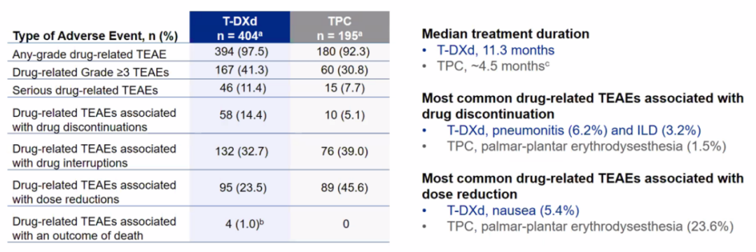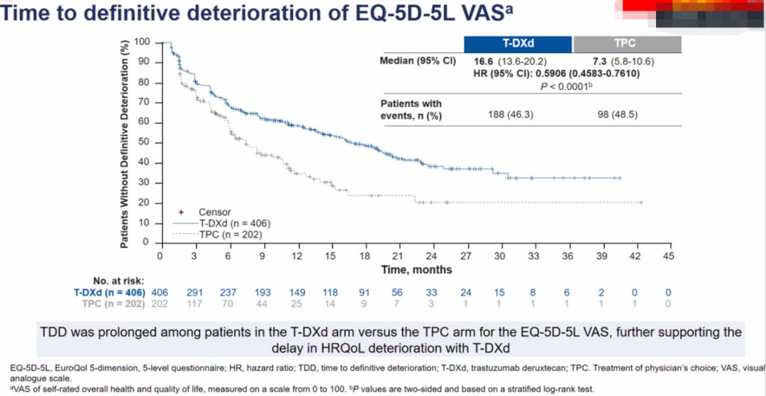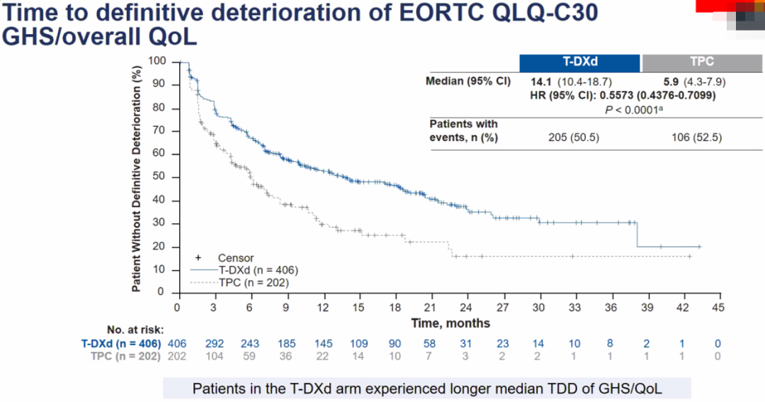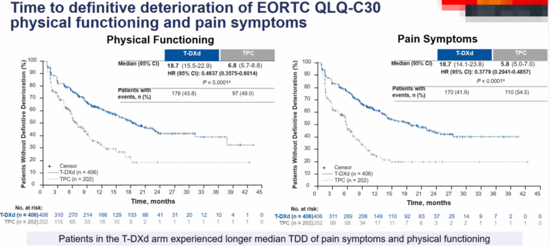 该研究结果表明了与医生选择的化疗(TPC)相比,T-DXd能为患者带来了更好的生活质量,且接受T-DXd治疗的患者生活质量至明确恶化时间也被延缓了。更具体来讲,T-DXd组的患者总体健康状况、整体生活质量、身体机能和疼痛症状方面至明确恶化的时间要比医生选择化疗的患者晚。DESTINY-Breast02研究和患者报告结局数据验证了T-DXd对T-DM1耐药且HER2阳性的转移性乳腺癌患者的获益。