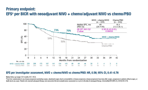 至少随访15.7个月后,在CheckMate 77T试验中,新辅助纳武利尤单抗联合化疗加辅助纳武利尤单抗组相比新辅助化疗加辅助安慰剂的对照组显著改善了中位无事件生存期(EFS),分别为未达到vs. 18.4个月(风险比[HR]=0.58;97.36%置信区间[CI]: 0.42-0.81;p=0.00025)。