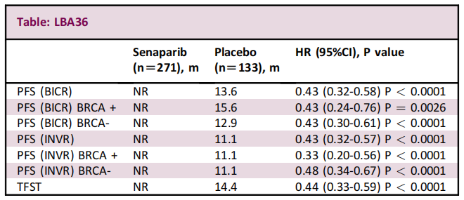 塞纳帕利维持治疗在新诊断晚期卵巢癌患者中的有效性和安全性(FLAMES研究):一项随机、双盲、安慰剂对照Ⅲ期试验(摘要号:LBA36)