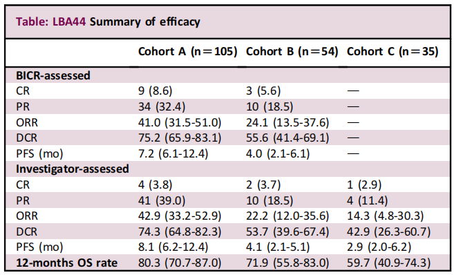 结果:截至2023年4月21日数据截止时,共有194例患者接受随机分组(A组:n=105,B组:n=54,C组:n=35),46例(23.7%)患者仍在接受治疗。77.8%的患者为鳞癌,63.9%的患者为PD-L1阳性,31.4%的患者既往接受过靶向治疗。中位随访时间为9.9个月(IQR 7.3-15.1)。抗肿瘤活性见表2。治疗相关不良事件(TRAE)发生率分别为100%、94.3%和100%。分别有84.8%、15.1%和60.0%的患者报告了≥3级TRAE,其中最常见的是中性粒细胞计数减少(23.8%,1.9%,30.0%)、高血压(22.9%,0,0)、白细胞计数减少(20.0%,0,33.3%)和贫血(20.0%,1.9%,13.3%)。分别有19.0%、5.7%和0例患者因AE而停药。A组中有2例(1.9%)患者报告了与治疗相关的死亡(急性冠状动脉综合征,感染和脓毒症)。