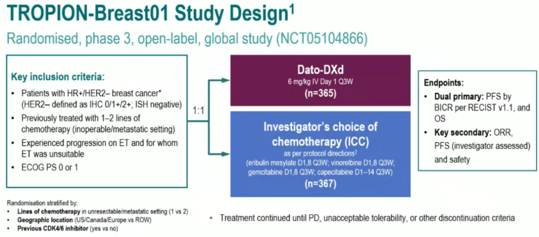 TROPION-Breast01是Dato-DXd首个治疗乳腺癌的全球、随机、开放标签、Ⅲ期试验,入组了732例患者。入组患者为接受内分泌治疗后疾病进展或不适合内分泌治疗(必须至少接受过1-2线化疗)的不能手术或转移性HR+/HER2-(IHC 0,IHC 1+或IHC 2+/ISH-)乳腺癌患者,随机分组后,试验组采用Dato-DXd(Dato-DXd组),而对照组则应用研究者选择的单药化疗方案,例如卡培他滨、长春瑞滨、吉西他滨或艾立布林(ICC组)。该研究由第三方独立委员会进行审查,其结果具更高的可靠性。