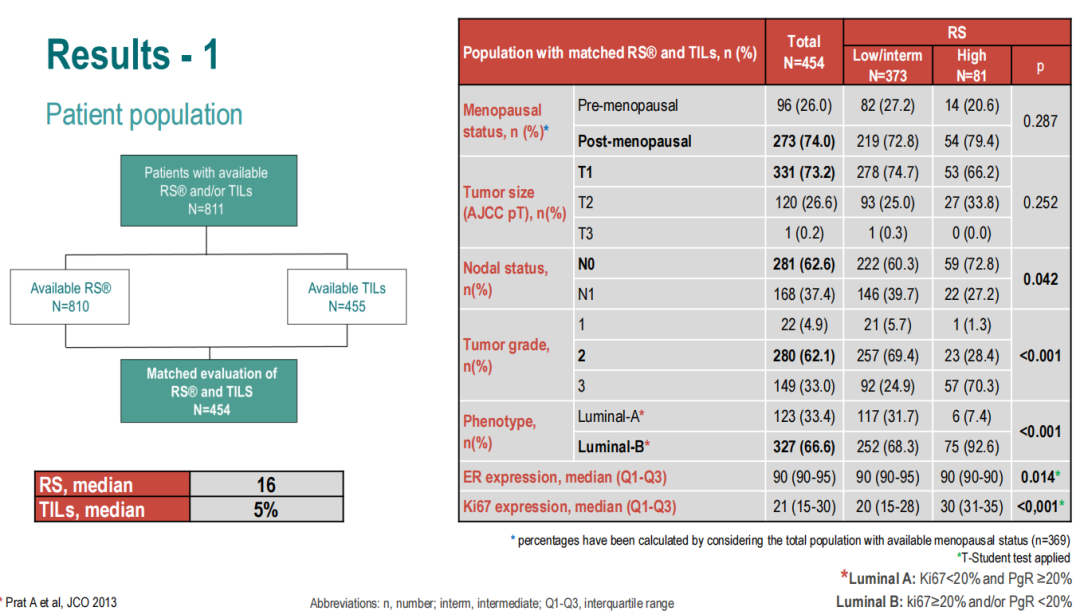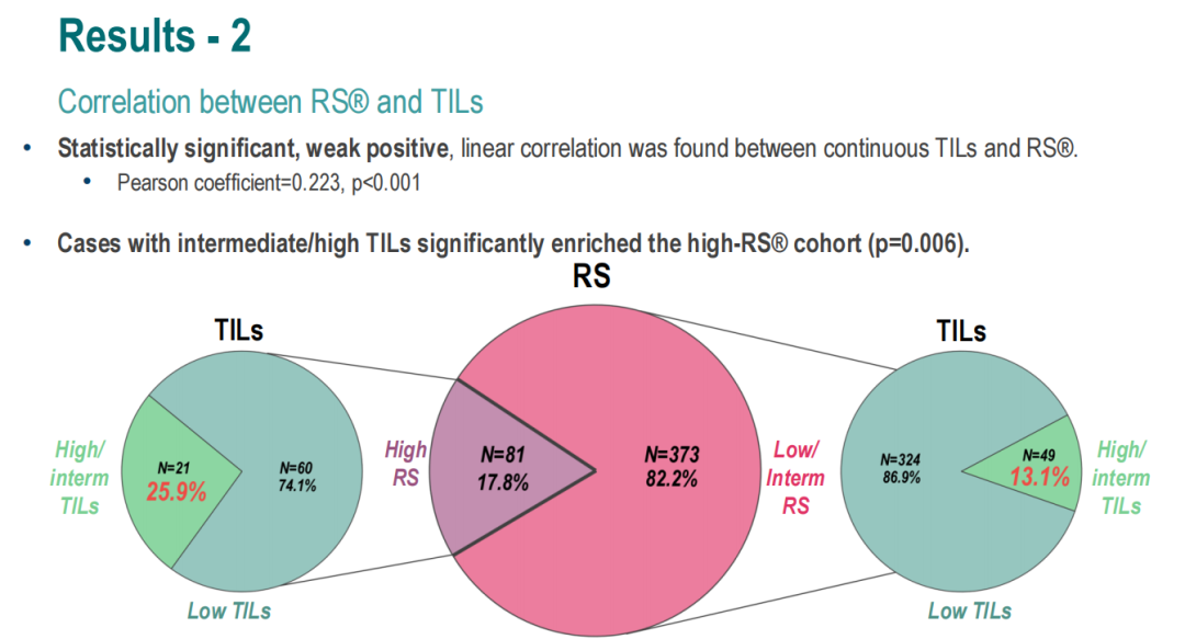 这项研究共入组了811名患者。RS分布为(n=810):低危22.0%,中危61.2%,高危16.8%。TILs分布为(n=455):低TILs84.6%,中等TILs13.6%,高TILs为1.8%。同时具有RS和TILs数据的患者共454名。RS中位值为16分,TILs的中位值为5%。