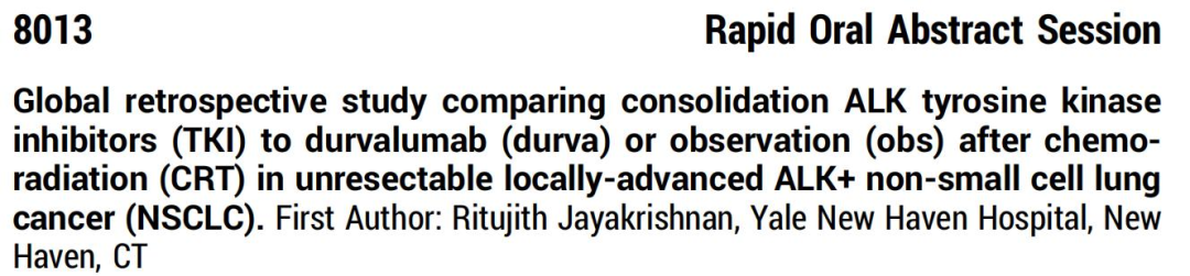 局部晚期不可切除的ALK阳性非小细胞肺癌患者,ALK-TKI、度伐利尤单抗强化治疗及临床观察的长期结局:一项多中心、回顾性临床研究(摘要号:8013)