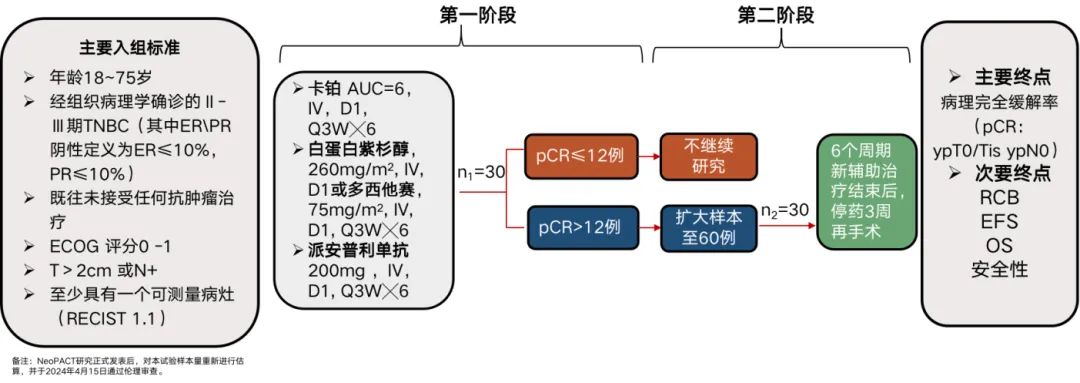 主要终点是病理完全缓解率(pCR:ypT0/Tis ypN0),次要终点包括肿瘤残余负荷(RCB)、无事件生存期(EFS)、总生存期(OS)和安全性。本研究采用Simon二阶段设计,如果在第一阶段入组的30例患者中,超过12例达到pCR,则进入第二阶段继续入组30例患者;反之,则终止研究。考虑10%脱落率,该研究计划入组67例患者。
