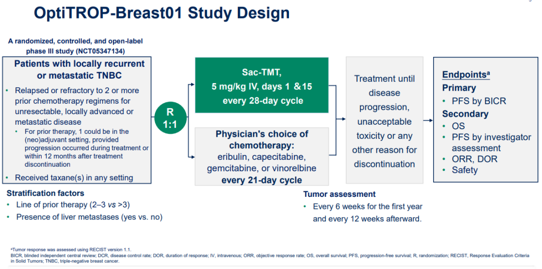 本次披露的是由徐兵河院士牵头的Ⅲ期研究,这项OptiTROP-Breast01研究主要纳入既往至少接受过2线标准治疗(至少含1次晚期阶段的标准治疗)的不可切除的局部晚期或转移性TNBC患者,患者均为紫杉烷类经治后进展或不耐受。计划纳入254例患者,按1:1随机分组分别予以芦康沙妥珠单抗或医生选择的标准治疗方案(TPC),主要研究终点为独立审查委员会(IRC)评估的PFS,次要研究终点为研究者评估的PFS、ORR、DCR、DoR、OS等。