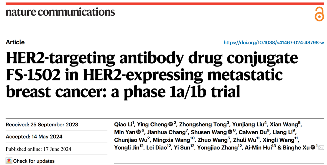 编者按:2024年6月27日,《自然-通讯》(Nature Communications)杂志发表了由中国工程院院士徐兵河教授及其联合团队开展的一项1期临床试验结果,该研究聚焦于一种新型的HER2抗体药物偶联物(ADC)FS-1502,有望为HER2阳性乳腺癌患者提供一种潜在的新治疗选择。