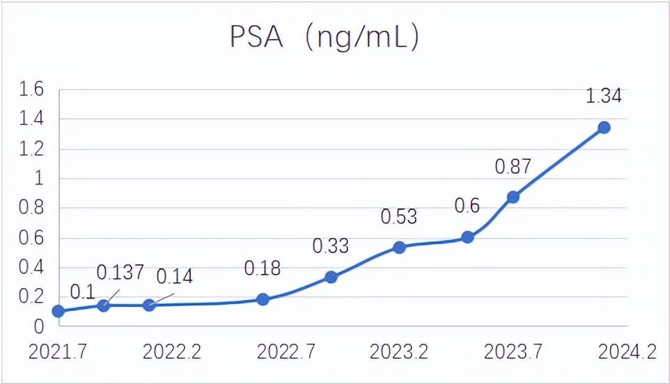 血清PSA变化:2018年7月术后稳步下降,2021年7月开始逐渐升高(2021-07、2021-09、2022-1、2022-06分别为0.10、0.137、0.14、0.180 ng/mL),2022年9月PSA升高至0.33 ng/mL,此后继续呈上升趋势(2023-02、2023-05、2023-07、2024-01分别为0.53、0.6、0.87、1.34 ng/mL)。