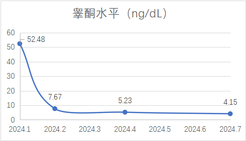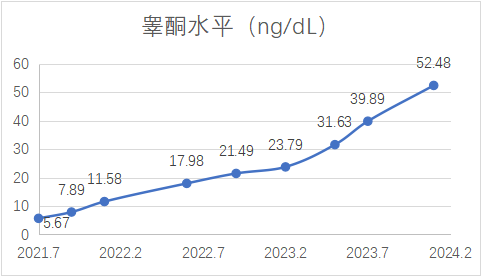 血清睾酮变化:2021-07、2021-09、2022-1分别为5.67、7.89、11.58 ng/dL;2022-06、2022-9分别为17.98、21.49 ng/dL;2023-02、2023-05、2023-07、2024-01分别为23.79、31.63、39.89、52.48 ng/dL。