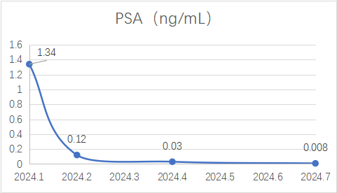 2024-02、2024-04、2024-07外院复查血清PSA分别为0.12、0.03、0.008 ng/mL;复查血清睾酮分别为7.67、5.23、4.15 ng/dL。